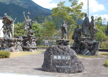 ここに志士の足跡が残る地を選び、八志士の群像を建て「維新の門」と名づけ、その功績と英姿を永遠に伝える。